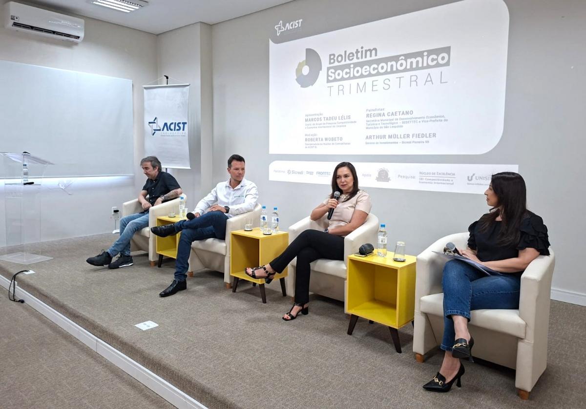 Após a explanação, houve um painel momento de debate e análise dos dados, o qual contará com os seguintes painelistas: Regina Caetano, vice-prefeita e titular da Secretaria Municipal de Desenvolvimento Econômico, Turístico e Tecnológico (SEDETTEC), e Arthur Celli, coordenador de Finanças e Economia do Sicredi Pioneira — a mediação foi Roberta Wobeto, coordenadora do Núcleo de Contabilistas da ACIST-SL.
