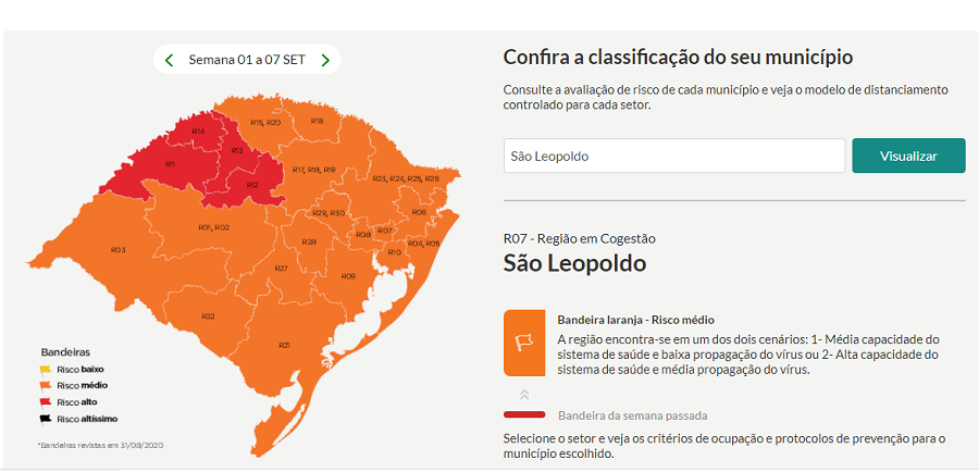 A divulgação das bandeiras definitivas, que ficam vigentes da 0h desta terça, 1 de setembro, até às 23h59 da próxima segunda-feira, dia 7, foi feita hoje, 31 de agosto por meio de material publicado no portal de notícias Governo Estadual. A partir desta semana, as transmissões ao vivo do governador Eduardo Leite serão feitas nas quintas-feiras, às 14h.