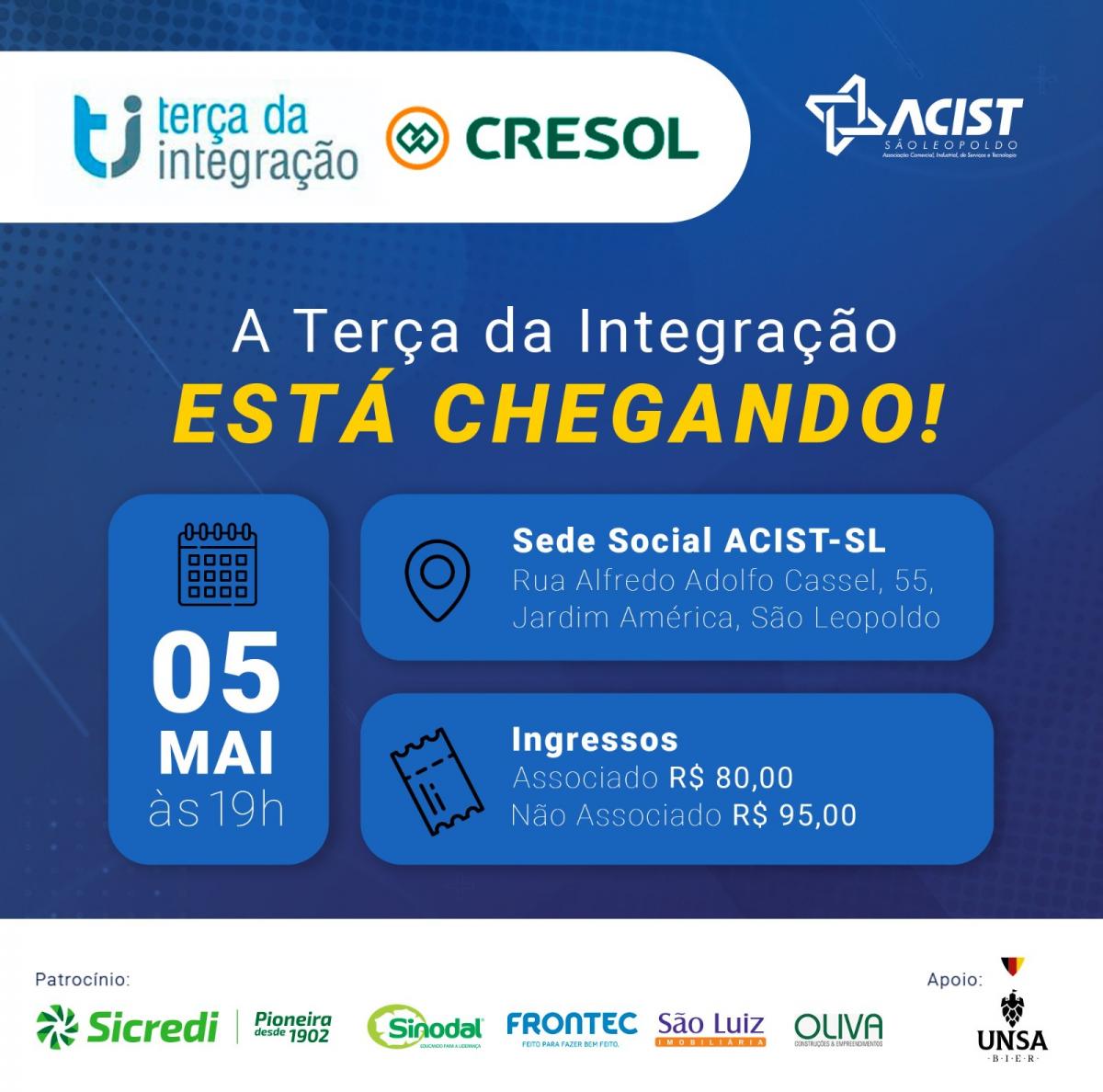 Acontece no próximo dia 05/05, às 19h, na sede social da ACIST-SL, a edição de maio da tradicional "Terça da Integração". O jantar será promovido pela Cresol São Leopoldo.