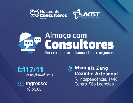 O Núcleo de Consultores da ACIST-SL promove no próximo dia 17/11, o 'Almoço com Consultores'. O evento tem como objetivo impulsionar ideias e negócios, promovendo conexões entre profissionais e empresários, contribuindo para o fortalecimento e crescimento da sociedade leopoldense.